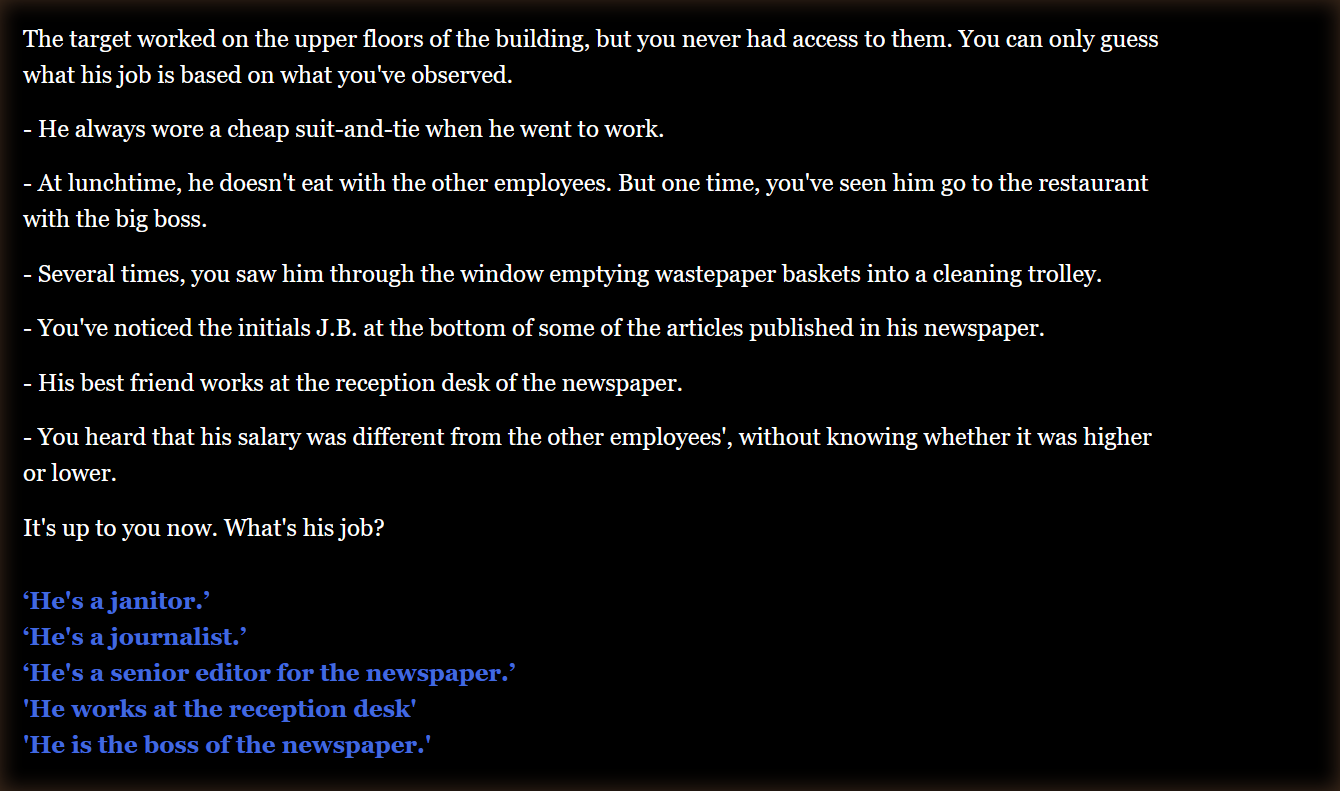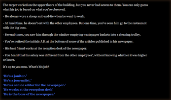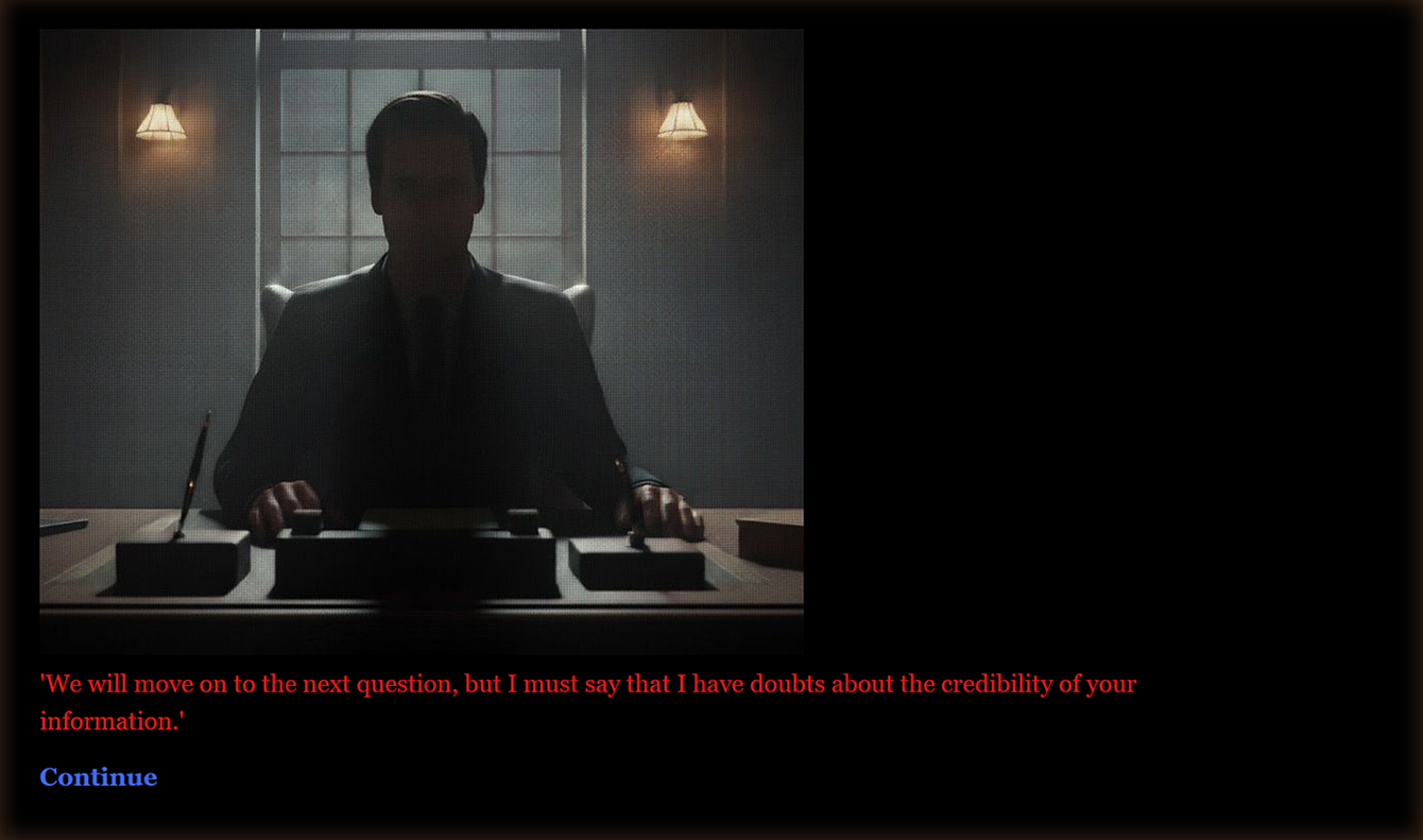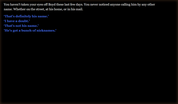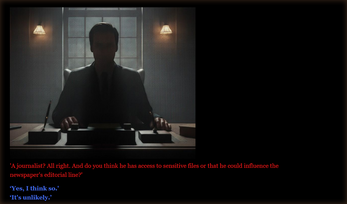 Context is a short, multiple-choice narrative game where you must choose your words carefully to decide the fate of the targets you have been ordered to spy on.